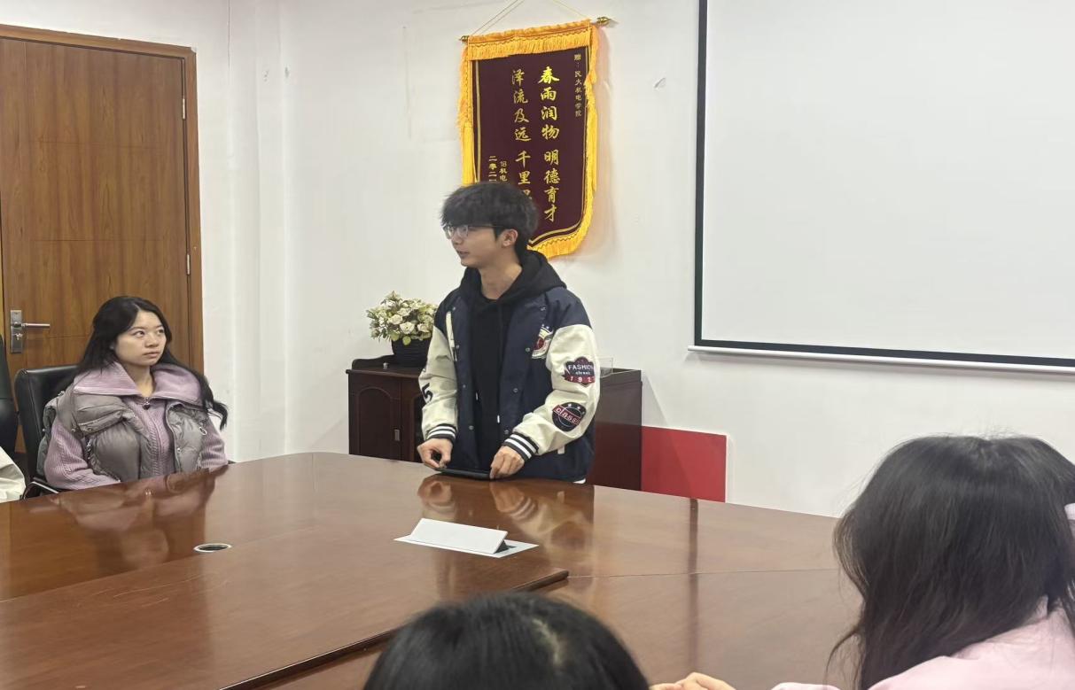 会议伊始,杨诗祺结合“青年强,则国家强”的时代号召,向全体成员寄语。她表示,分团委是青年成长的“练兵场”,更是服务同学、助力学院发展的重要平台,希望大家既要以“功成不必在我”的境界扎根服务,也要以“功成必定有我”的担当主动作为,在实践中锤炼本领、实现成长。真挚的话语既点明了分团委的工作底色,也为新成员锚定了成长方向。